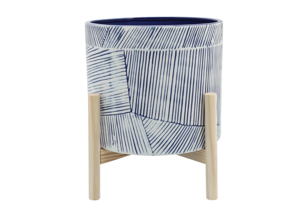 This 10 Inch Navy Planter With Wood Stand is a modern-style ceramic planter with a blue color and a secondary wood material. The planter is assembled and has no additional properties other than its color and materials used.