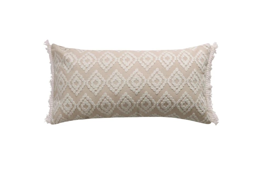 Bring a touch of casual elegance to any room with our 12X24 Diamond Fringe Pillow, crafted from soft and durable cotton. This oversized pillow features a stunning diamond pattern and playful fringe, making it the perfect accent piece for your home decor.