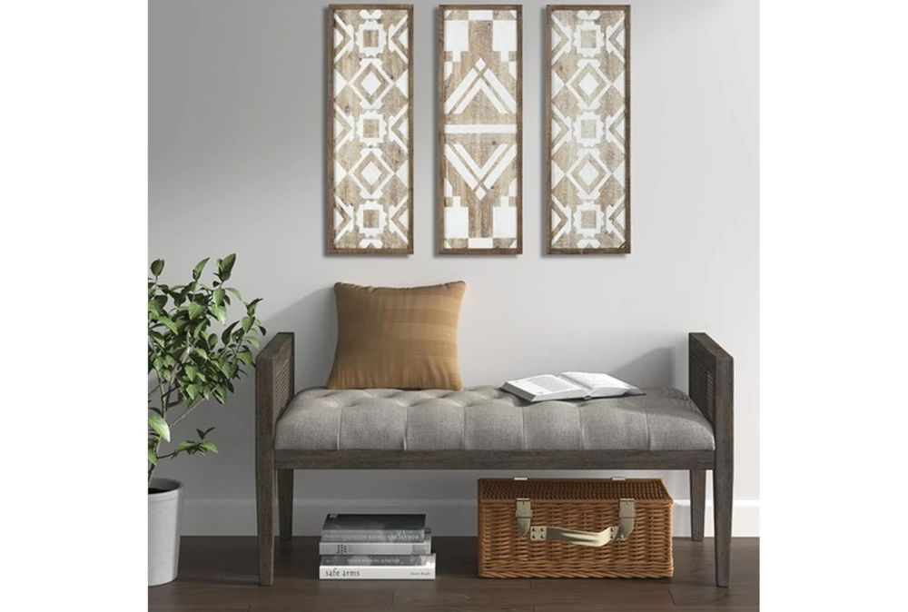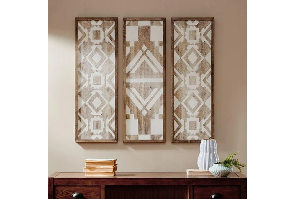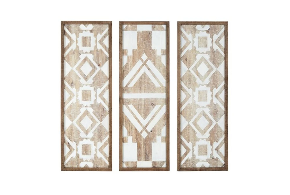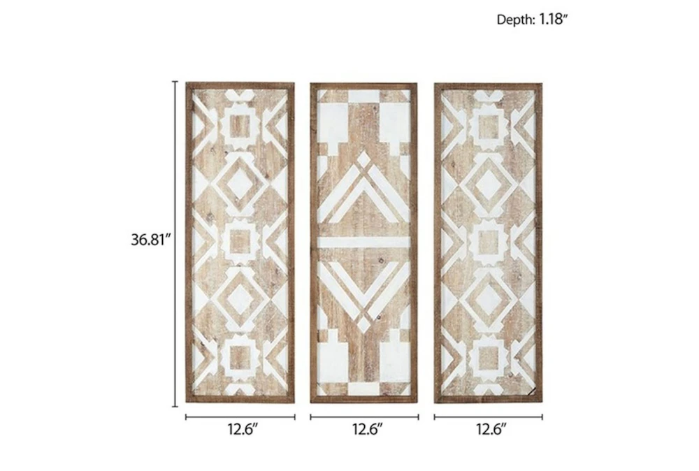 This set of three traditional style wood wall panels features a two-tone geometric design, made from a combination of natural MDF and fir wood materials. The panels are 13 inches wide and 37 inches tall, and are composed of 80% MDF and 20% fir wood.