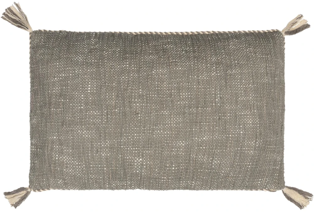 This modern lumbar throw pillow boasts a warm gray and cream braided edge with tassel corners and is crafted from high-quality, durable fabric. Elevate your home decor with this stylish accent piece that is the perfect addition to any living room or bedroom.