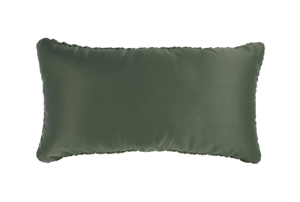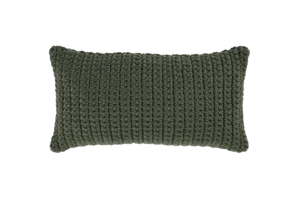 This lumbar throw pillow is an oversized, modern style made of 100% polyester in a vibrant green color that is designed to resist moisture and fading. Handwoven in a knitted style, it features a unique prism green pattern that adds a pop of color to any indoor or outdoor space.