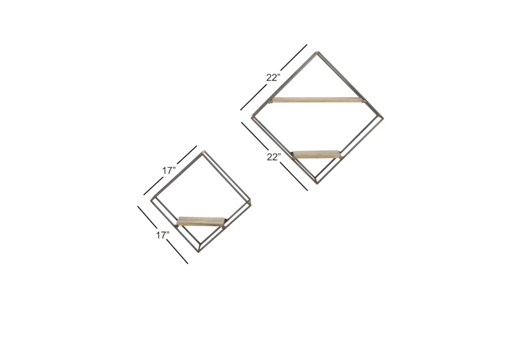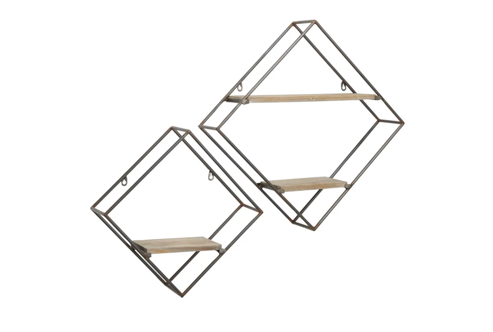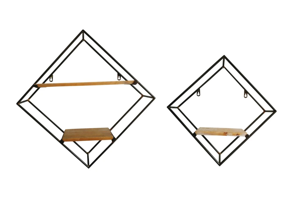 This set of two modern wall shelves is designed with rugged charm and edgy allure, featuring a diamond frame with 2 tier shelf and a mix of black iron and natural wood materials. The black metal shelf frames with decorative rust detail and natural wood grain throughout the light beige wood interior shelves create an urban aesthetic that showcases your artistic expression, making them perfect for your living room or entryway.
