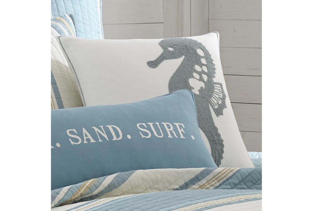This 18×18 decorative seahorse pillow is the perfect addition to any coastal themed room. Made of soft cotton, it features a beautifully designed seahorse in subtle shades of blue and green.