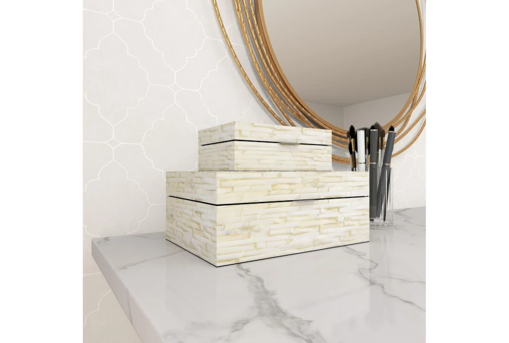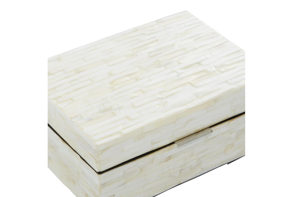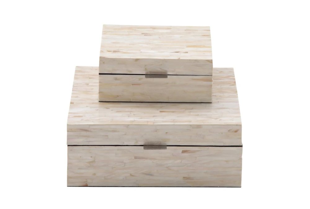 Perfect way to add depth and texture to your surface space with this compact and discreet box. A practical yet stylish upgrade that instantly elevate the look of your room. This coastal style wood storage box with lid will make a great jewelry box or a table centerpiece in your laidback home. Designed with black rubber stoppers at the base that prevent scratching furniture and table tops, as well as sliding around. This item ships in 1 carton. Mussel shell box makes a great gift for any occasion. Due to the handmade nature of this item, no two will be alike, there will be slight differences in shape, size, and color. Suitable for indoor use only. Made in Vietnam. Two decorative boxes for convenient storage. Coastal theme.