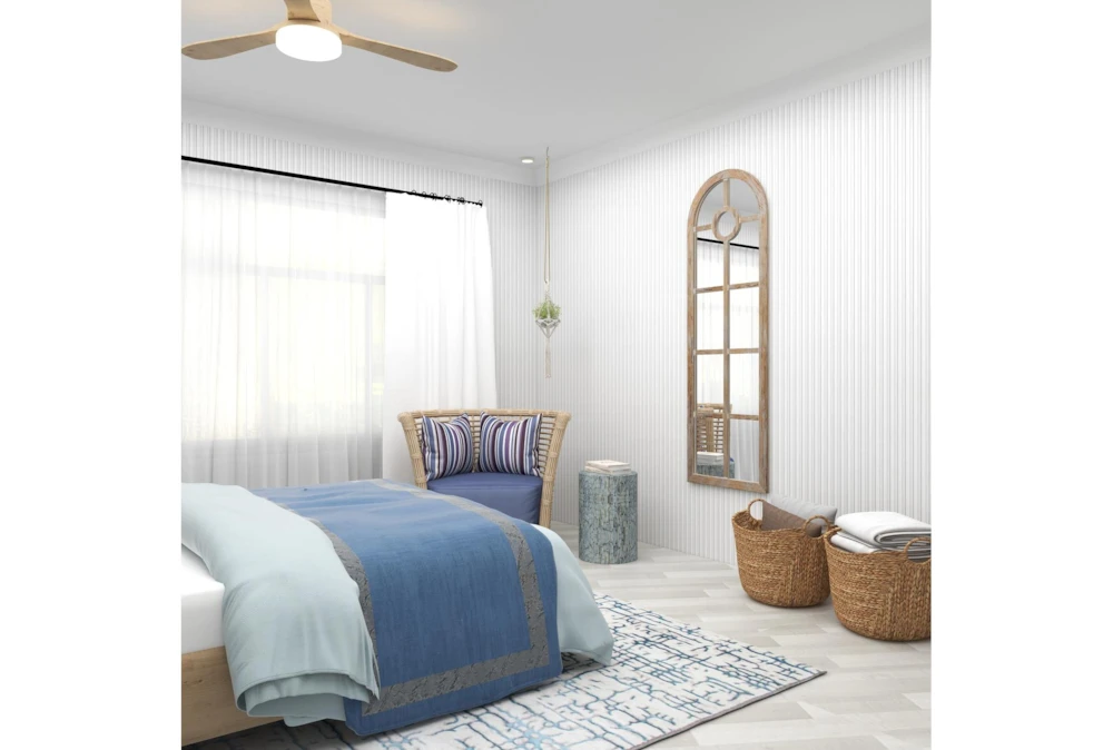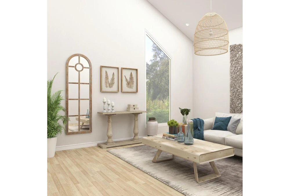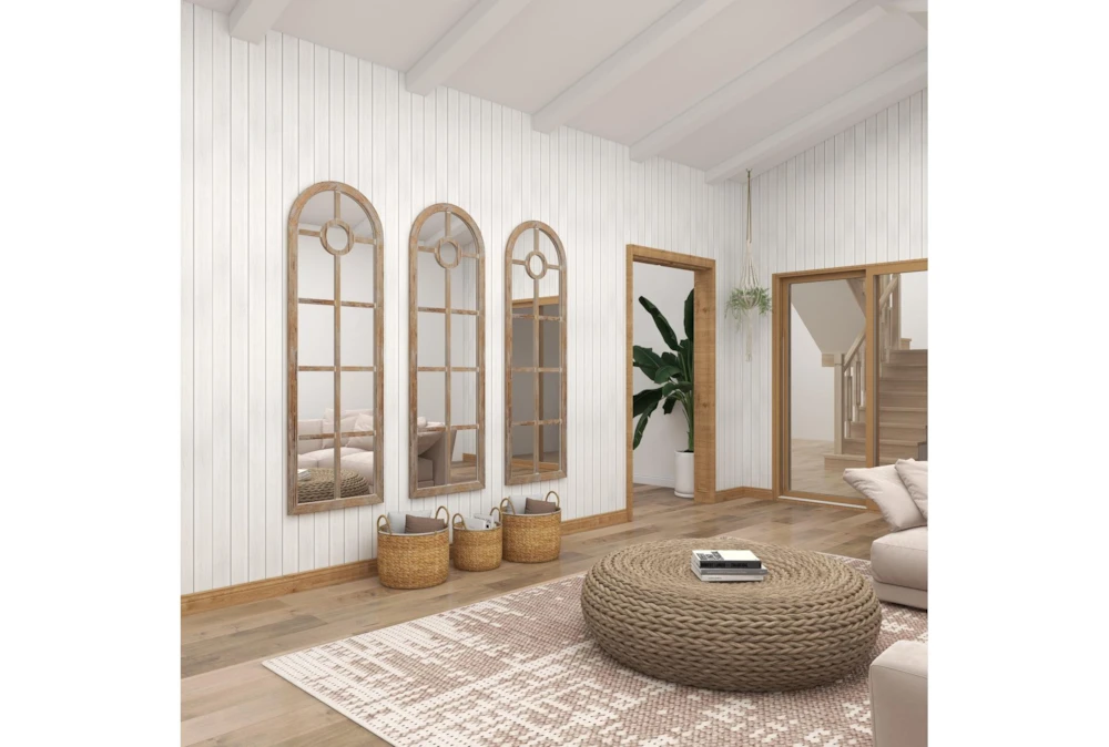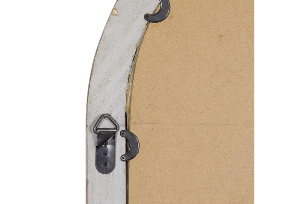 The whitewashed look on this decorative arch mirror was purposely done to achieve a timeless feel as a vintage-inspired wall art for coastal-themed living rooms. This item ships in 1 carton. It takes inspiration from large cathedral windows. This item hangs vertically via triangle ring hardware; nails and screws are not included. Suitable for indoor use only. Coastal style.