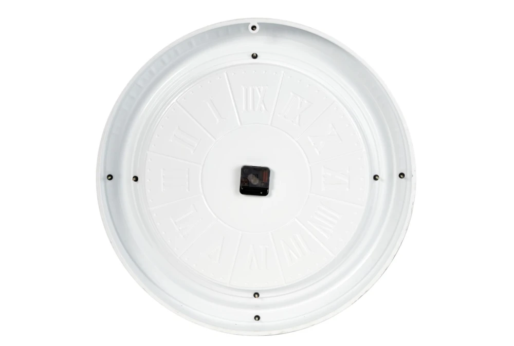 This round white wall clock is ideal for farmhouse, minimalist, and shabby chic-themed living spaces. Requires 1 AA battery. Battery not included. This item ships in 1 carton. Roman numerals clock face. The clock mechanism runs silent. Loop hardware is placed at the back section for easy hanging; nails and screws are not included. Suitable for indoor use only. Farmhouse style.