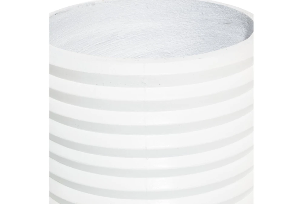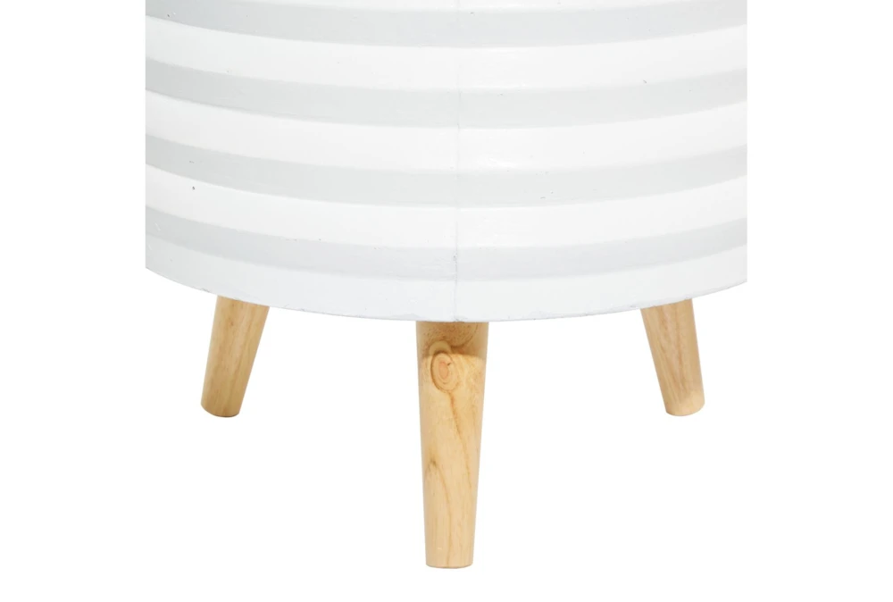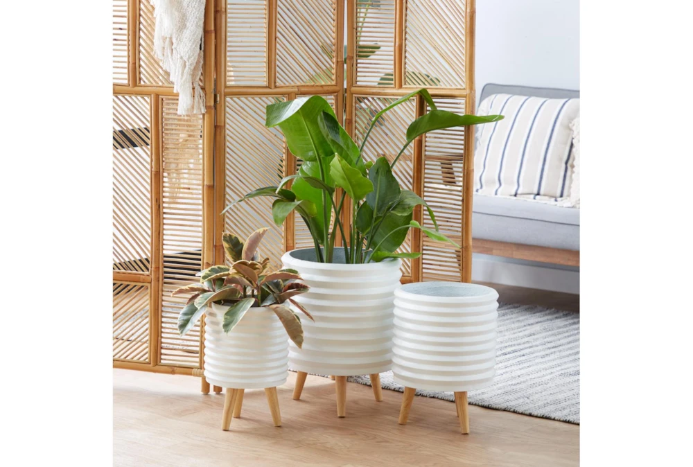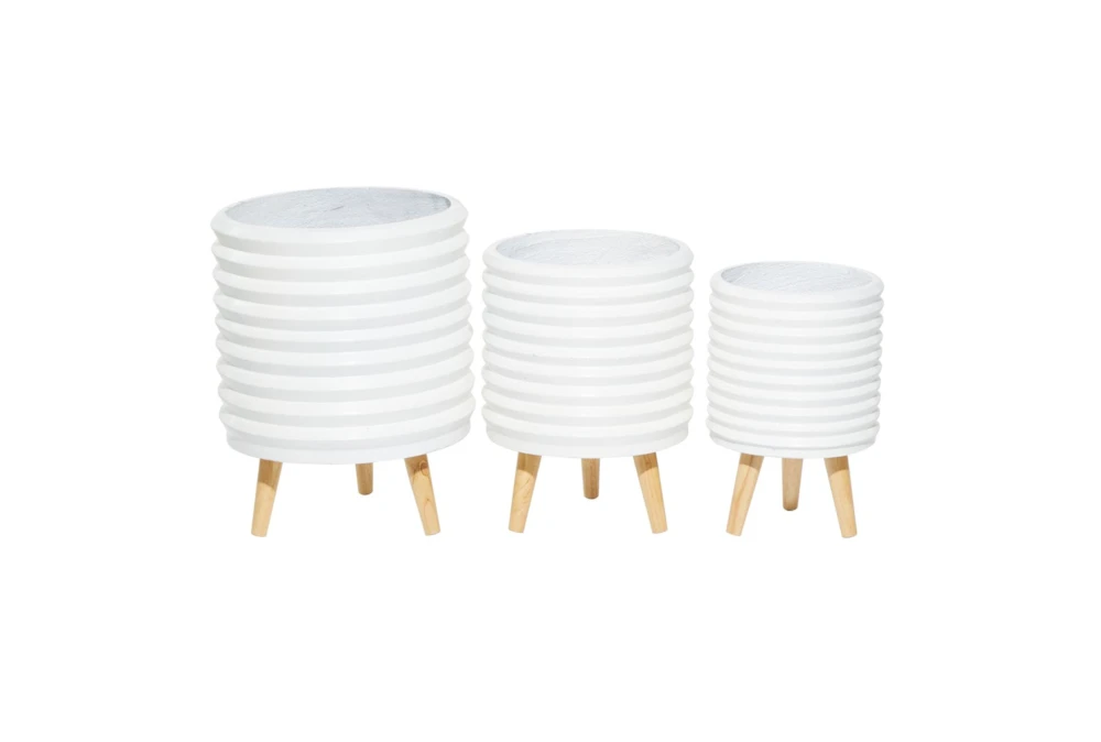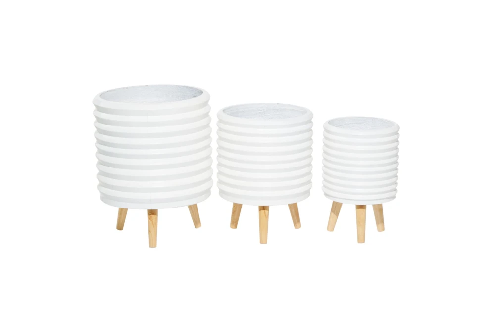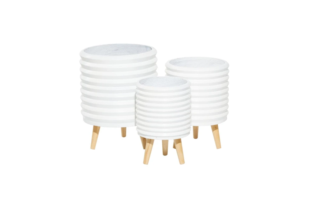 A smart chic style inspired living space knows how important mixing and matching is. Especially when it comes to adding some greenery in your space, this round white fiber clay horizontal grooves planter is up for that task. The fiber clay construction of this planter means toughness without sacrificing beauty and elegance thanks to its horizontal groove pattern design on the surface. The entire piece rests on a wooden tripod leg design with circular wooden legs in a light brown hue. This planter set will bring a much-needed freshness with indoor plants to your living room, dining room, home office or entry way. Ships in 1 carton. Suitable for indoor and outdoor use. No drainage holes. Each set includes with 3 planters. Contemporary design.