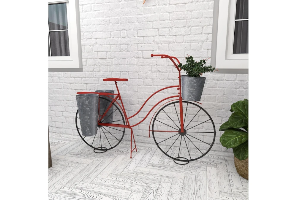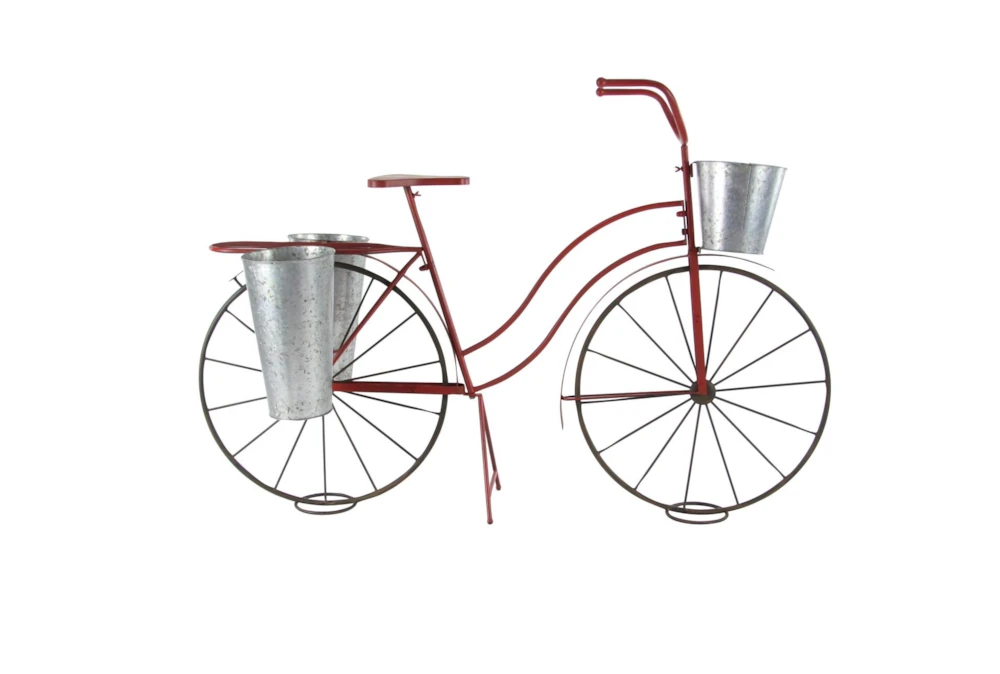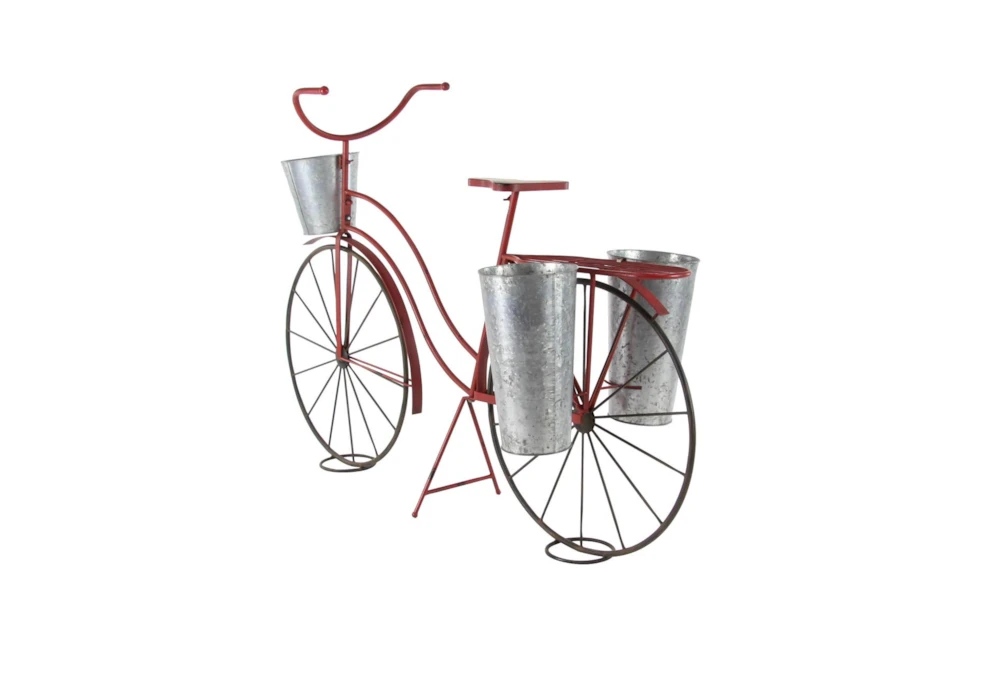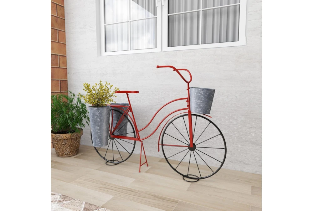 This 38 Inch Red Metal Bicycle Plant Stand adds a touch of vintage sophistication to your home with a traditional style and tall design. Made from lightweight tin, the stand features a polished red finish and galvanized silver planters attached to the bicycle frame.