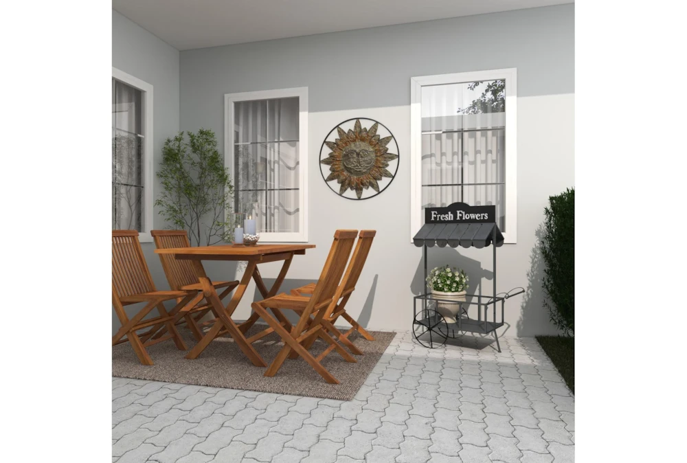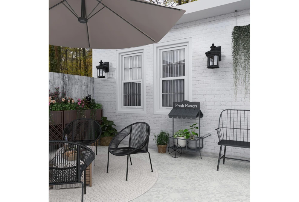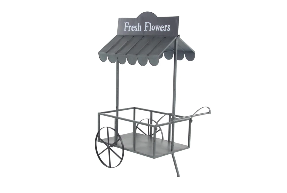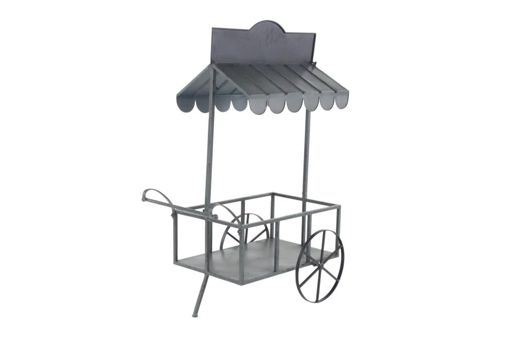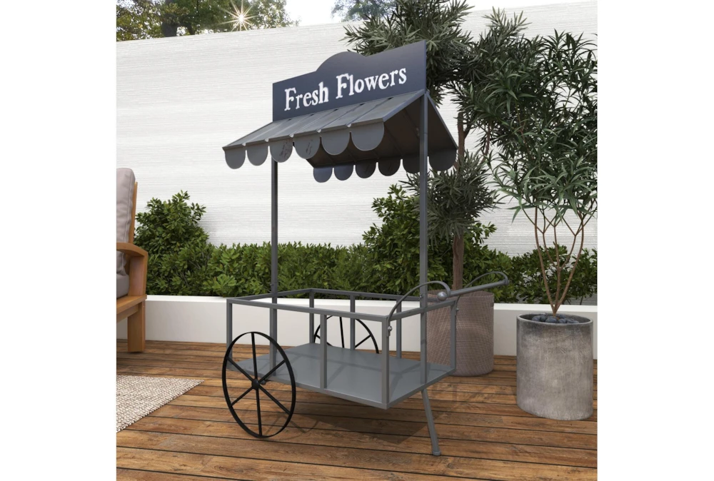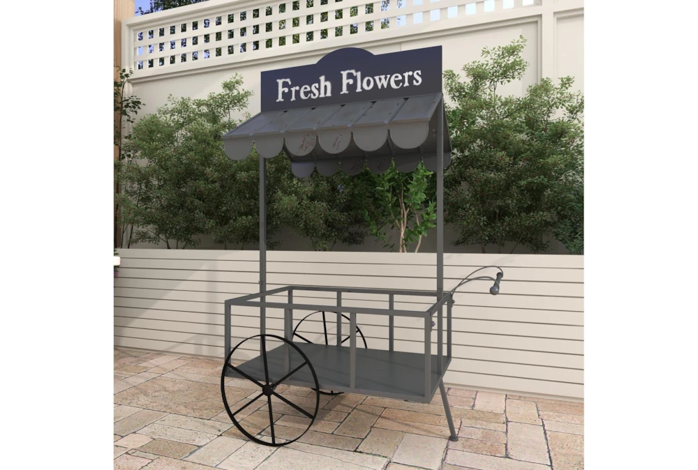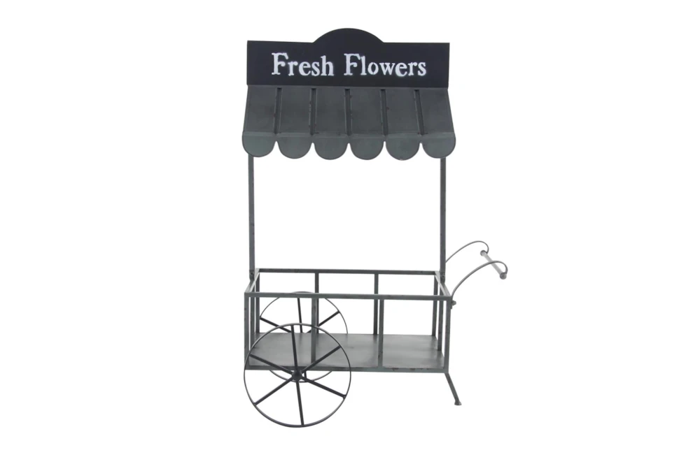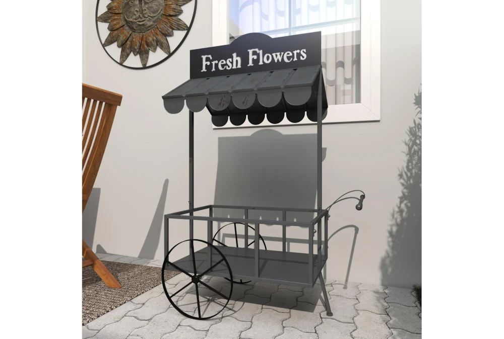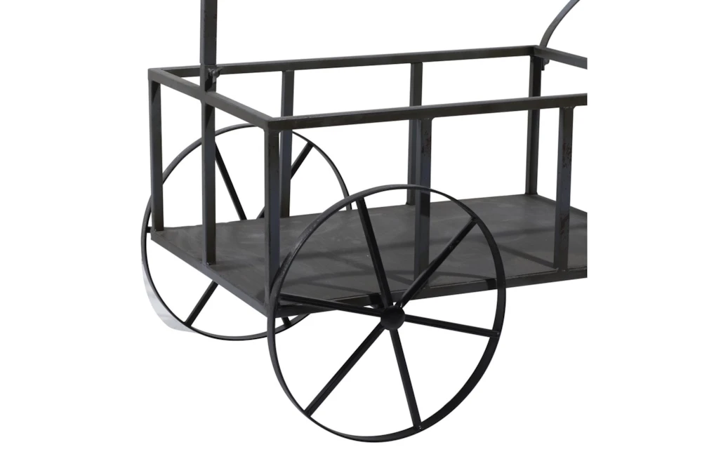 44 Inch Black Iron Plantstand: Tall, farmhouse-style metal stand with distressed gray and polished black finish. Features 2 large wheels, kickstand, and curved handle, perfect for displaying plants or adding a touch of cozy appeal to your home.