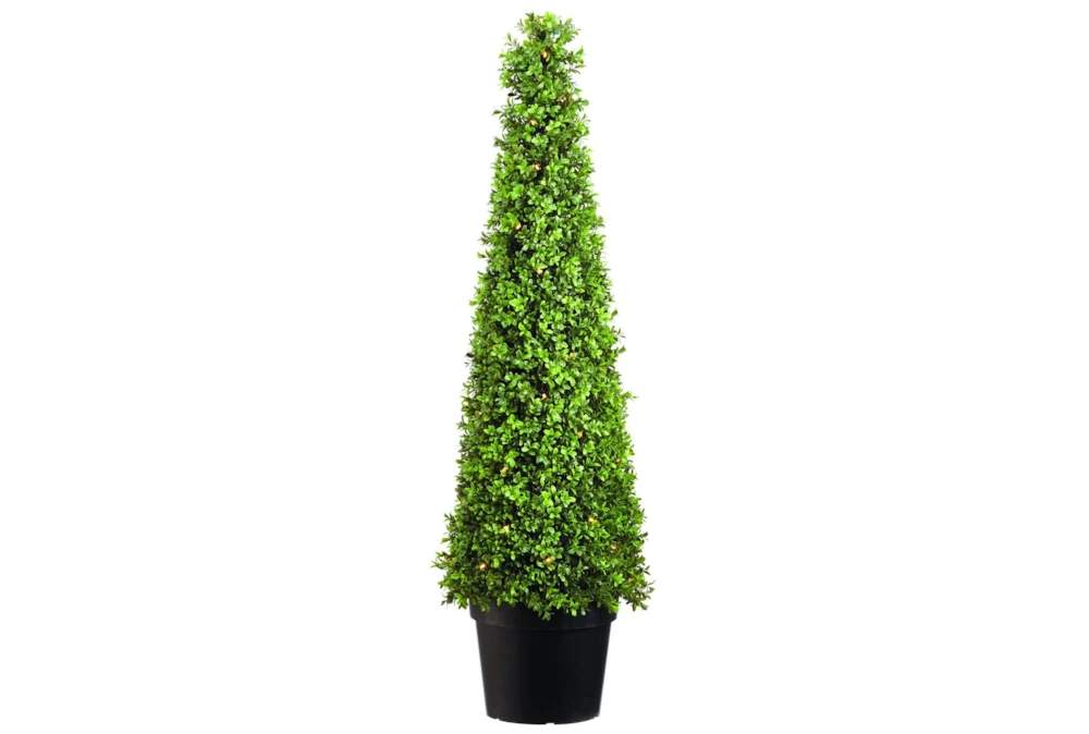 This 48-inch boxwood cone topiary tree is designed for both indoor and outdoor use and is made of durable plastic with UV protection. The tree also features battery-operated lights for added ambiance.