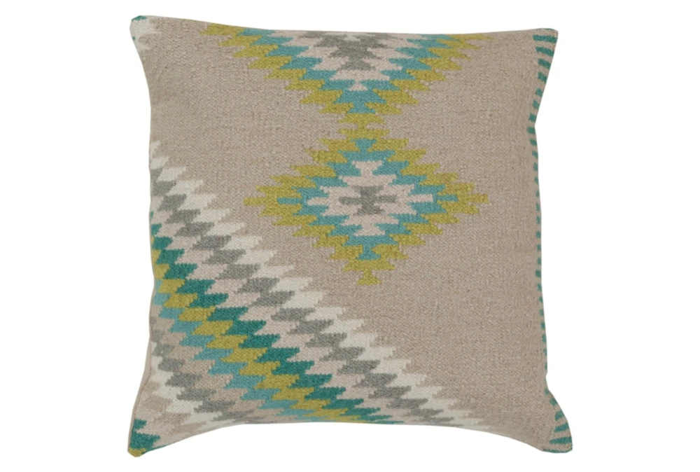 This Accent Pillow in Azteca Beige Multi measures 20×20 inches and features embroidery, making it a great addition to contemporary bedroom decor. Made of fabric and wool, it comes in natural colors of beige, aqua, olive, and lime.