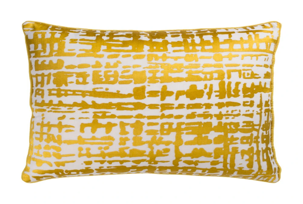 This Accent Pillow in Vesalia Gold measures 13X20 and features piping. It boasts a contemporary style, is made of a linen and cotton blend, and comes in a natural color with additional gold and ivory tones.