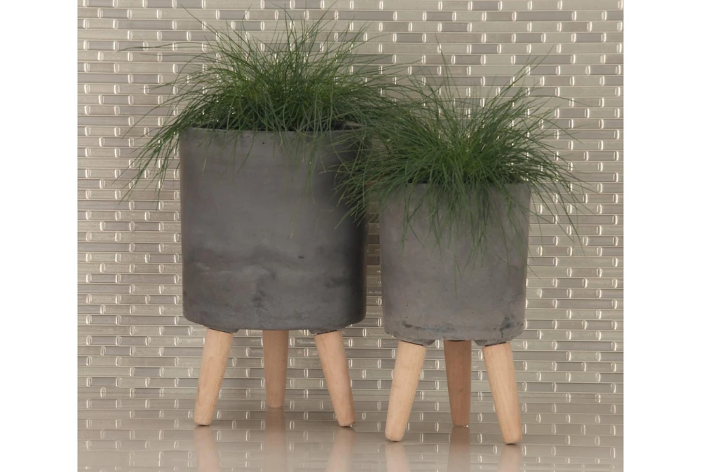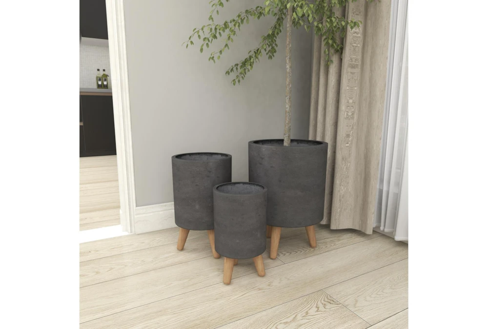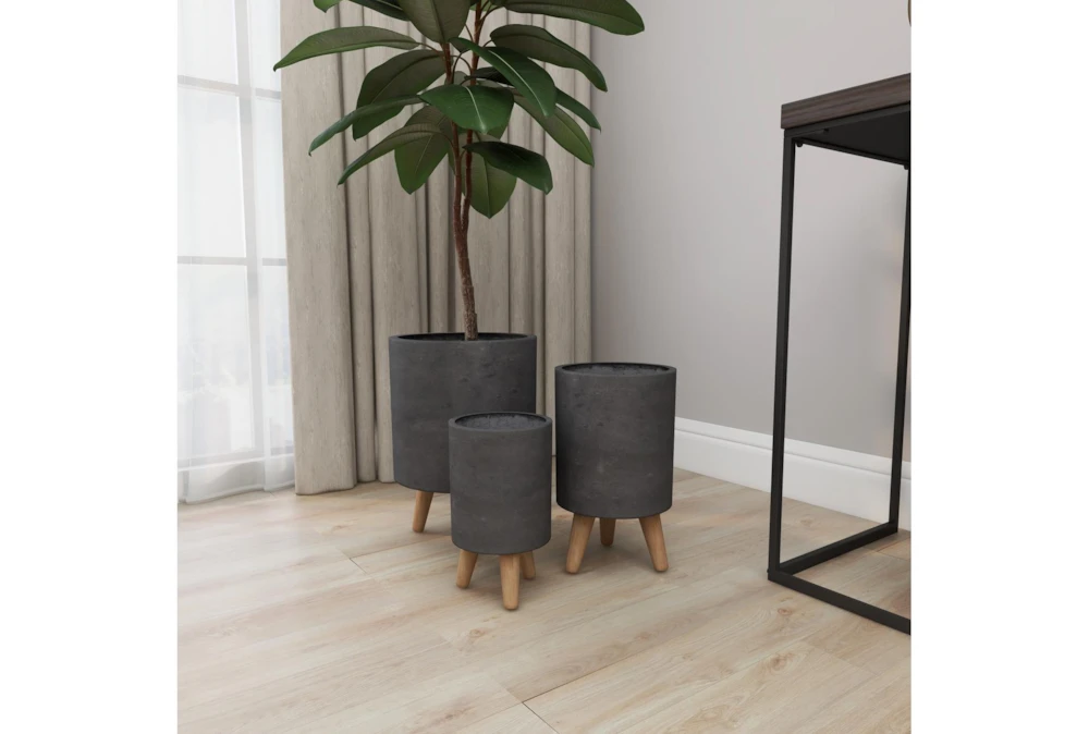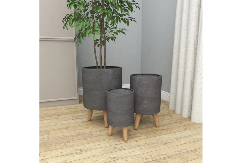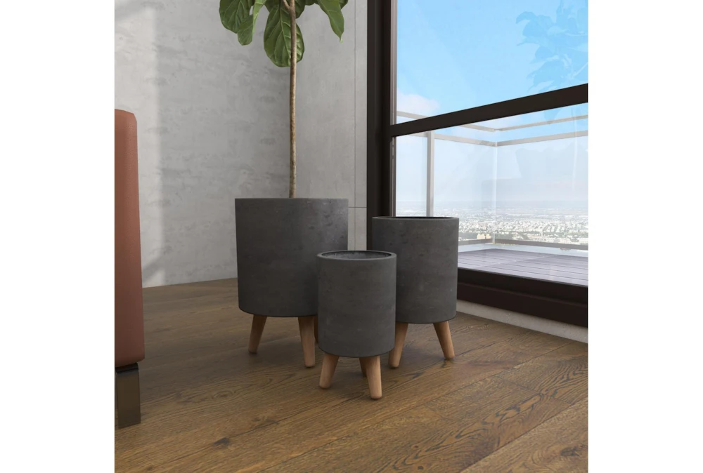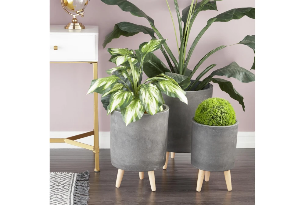 These ceramic planters are equipped with tripod mid-century legs supporting their tall, round bodies with a distressed, matte gray finish. Modern and contemporary settings are ideal for these planters, perfect for both indoor and outdoor use. Crafted from ceramic fiber clay with beech wood legs, the wide shapes and deep settings of these planters will stylishly display your herb garden, cacti, or other plant cuties perfectly. Contemporary accent decor great for both indoor and outdoor use to display your favorite flowers and plants Wipe clean with a dry cloth. Suitable for indoor and outdoor use. Each set comes with 3 planters. Contemporary design. This item comes shipped in one carton.