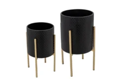 This Black/Gold Set of Two Textured Planters on Metal Stand adds a touch of modern elegance to any outdoor space. The tall planters are crafted from durable metal and feature a stylish textured design, while the sleek metal stands provide a sturdy base. Bring your outdoor decor to life with this stunning set of planters.
