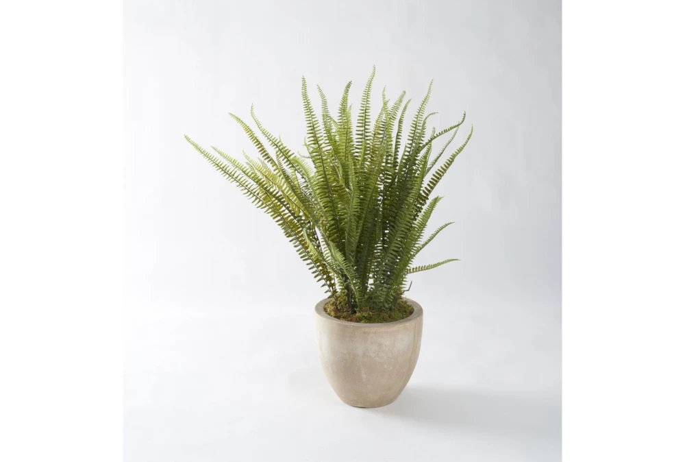 This Boston Fern comes in a contemporary round tan resin planter and is made with polyester materials. The green plant adds a pop of color to any space and is low maintenance, perfect for those without a green thumb.