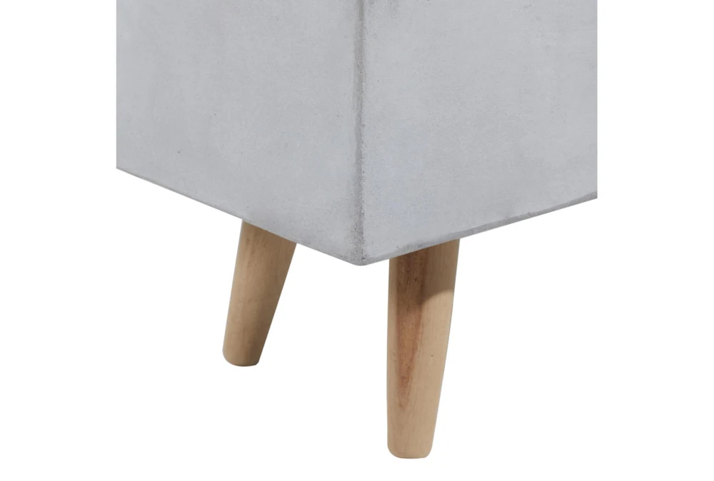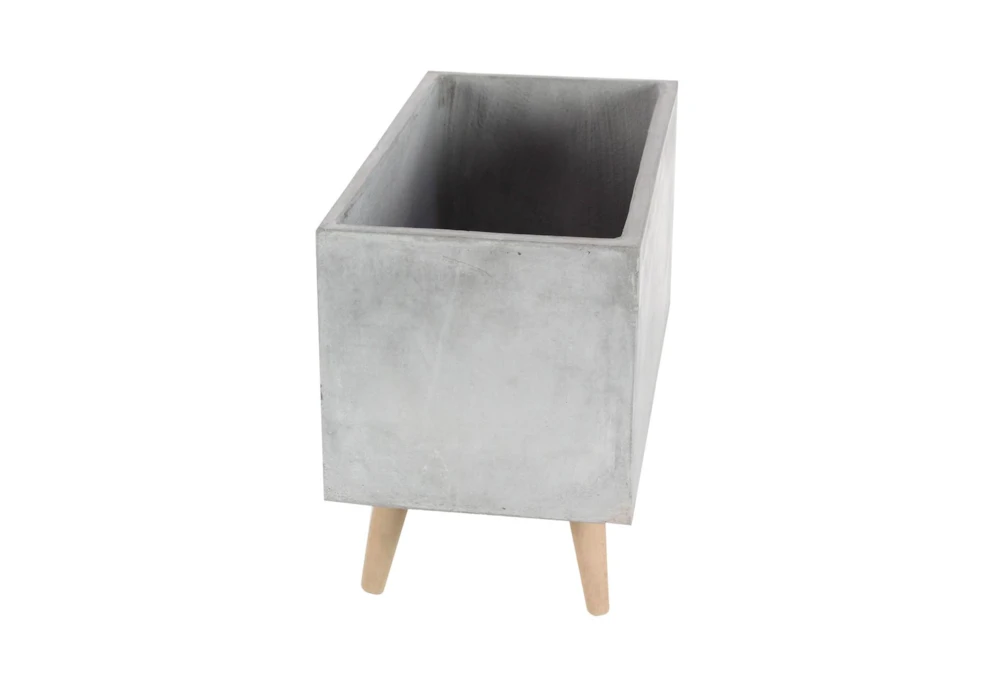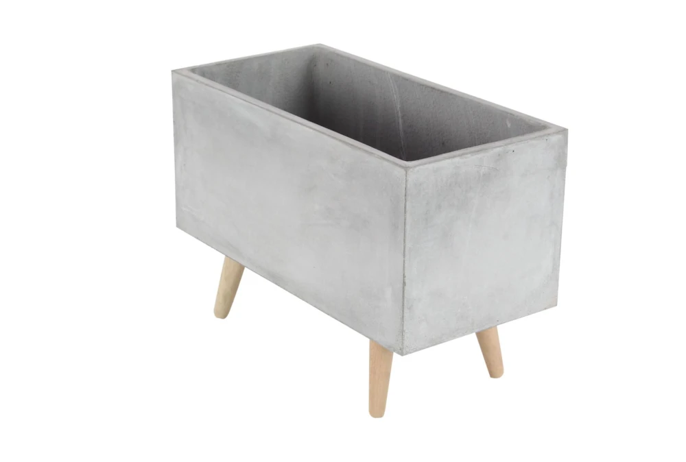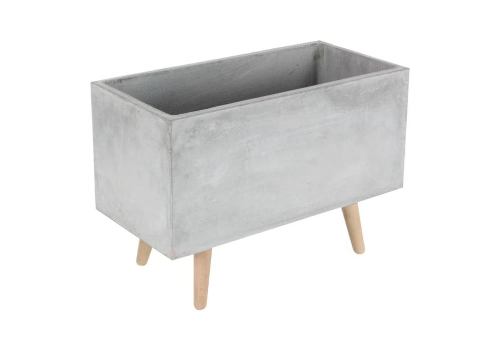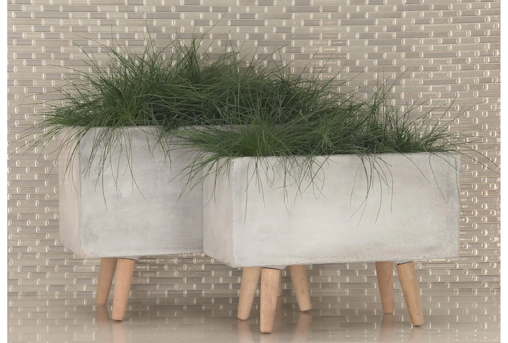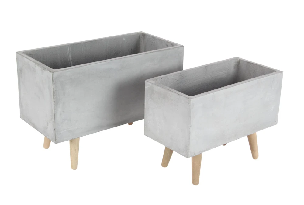 Set of two 17″, 21″ New Traditional fiber clay wood planters, gray rectangular box-shaped planters made of fiber clay and fiber glass with textured finish, four legs made of brown beech wood