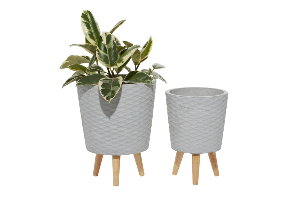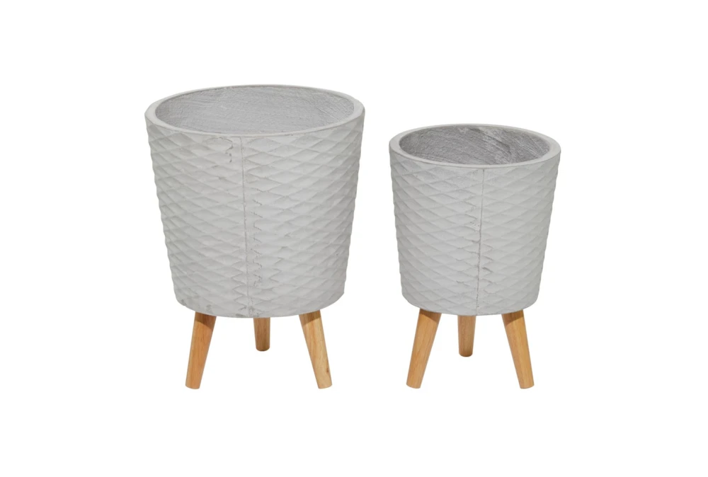 Verdant plants and flowering shrubs provide serene respite in these hectic times. And they need the proper holder to maintain a home’s theme. This set of two planters, crafted from fiber clay with light grey textured diamond patterns around the bodies, elevates the look of modern and contemporary-style homes and gardens. Place leafy plants and flowering shrubs to highlight the trendy style of gardens, patios, and indoor/outdoor spaces. Great additions to gardens, patios, and outdoor spaces with a modern and contemporary theme Wipe clean with a dry cloth. Suitable for indoor and outdoor use. Made in China These indoor planters come as a set of 2. Contemporary design. This item comes shipped in one carton.