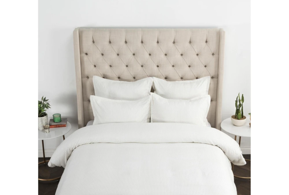 The King Duvet in Ivory with Gray Stitching is made of 100% cotton material and features a clean flange finish. Its rustic style is enhanced by the woven stitch design, making it a perfect addition to any natural-themed bedroom decor.