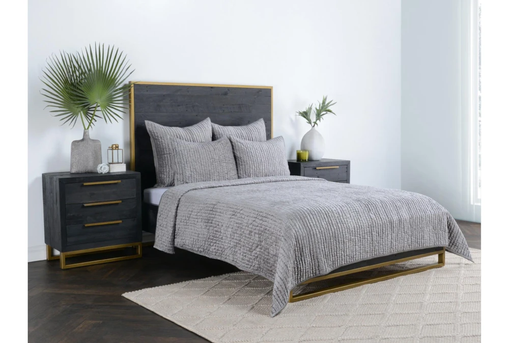 This modern King Quilt features a grey Rayon Velvet front and a cotton back, quilted and hand stitched for a unique and luxurious look. Made with 100% cotton and dyed and stonewashed for a soft hand feel, this grey quilt is a cozy addition to any bedroom.