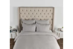 This Queen Duvet features a traditional style with a blue-grey herringbone pattern woven from a linen cotton blend. The duvet is made of a grey linen cotton blend with a herringbone pattern, providing a traditional style that is both comfortable and stylish.