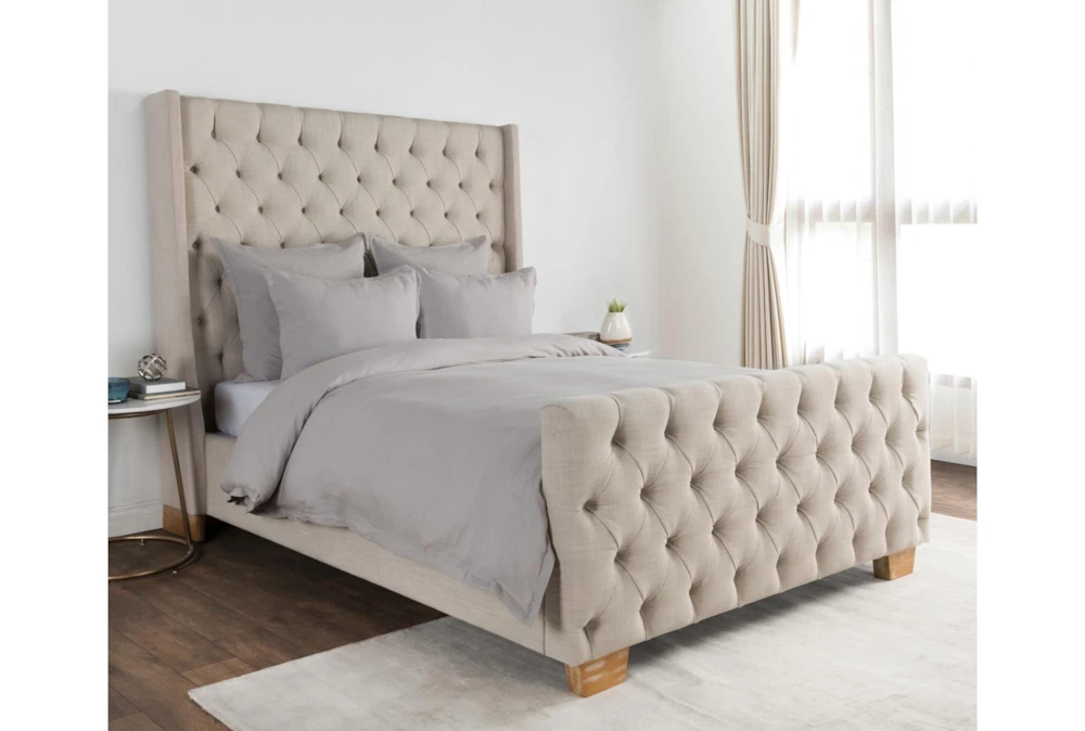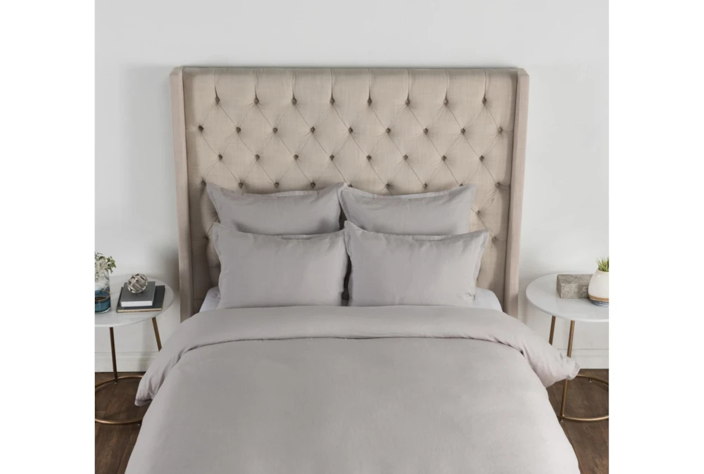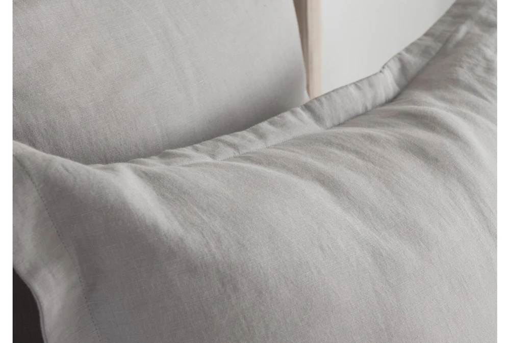 This queen duvet features a modern style and is made of a soft grey cotton linen blend. The dyed and washed material creates a soft hand feel, and the duvet includes a 1″ flange edge detail.