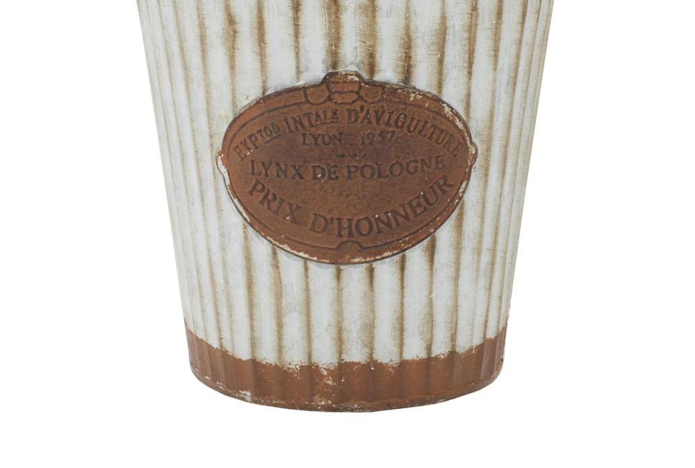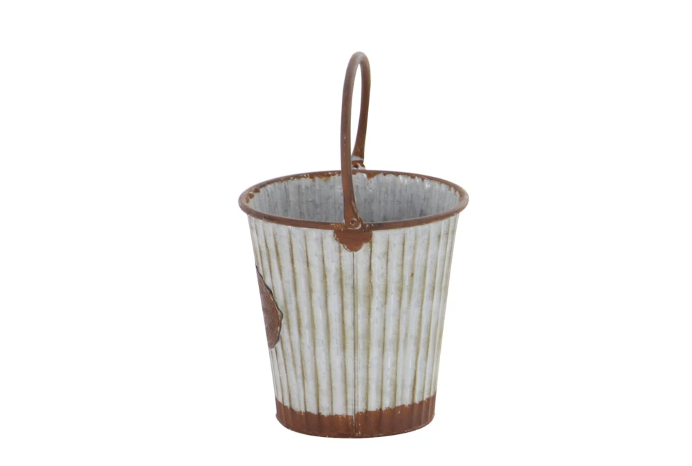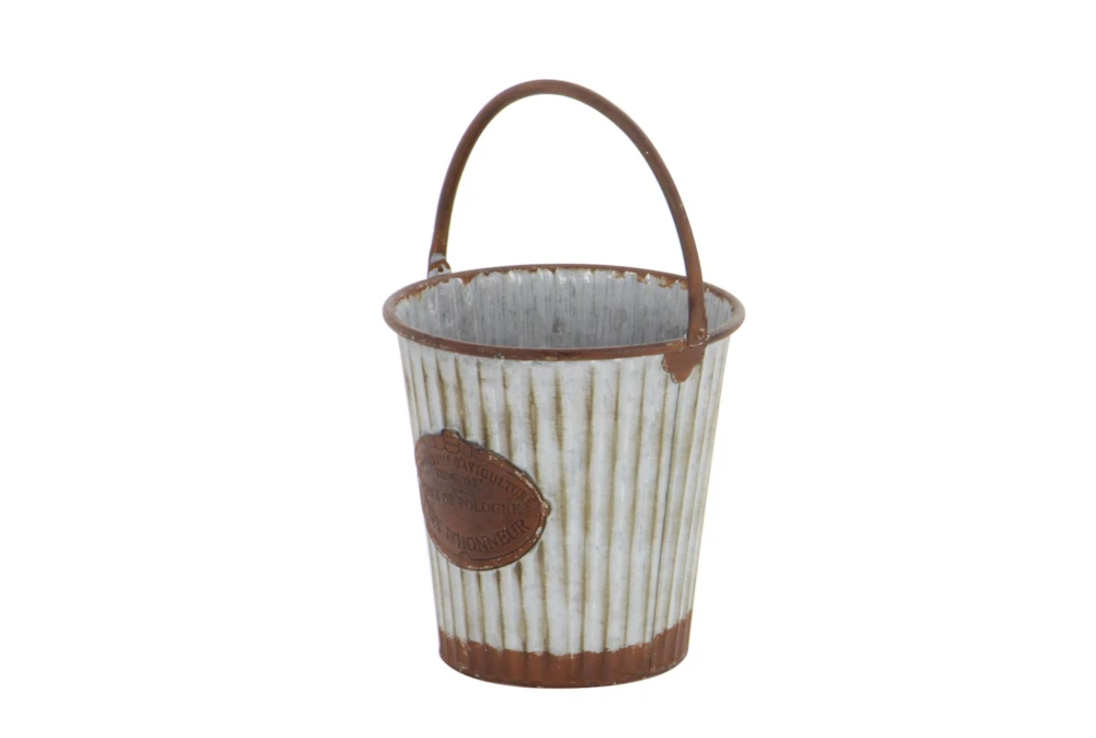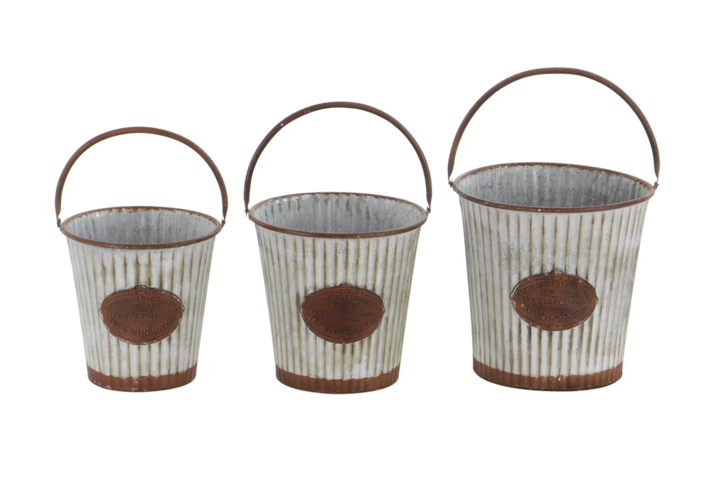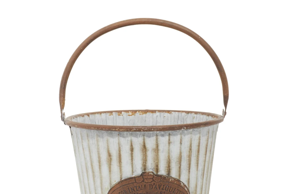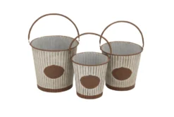 This set of bucket-inspired planters brings tranquility to your space by allowing you to fill them with plants—hence it promotes wellness and creates an immediate feeling of relaxation. These decorative planters are sure to add bundles of charm to your home. Beautifully detailed, they feature rounded pots in polished silver finish with rusted brown details and are designed with brown handles, rims, and bases. These planters are made out of tin with solid construction, offering durability. Jazz up farmhouse and industrial themed spaces using this set of charming accent pieces that are ideal for outdoor use. Use as plant holders or corner accent pieces in Farmhouse style interiors Wipe clean with a dry cloth. Suitable for indoor and outdoor use. Made in China. Pot have no drainage holes. This set includes 3 metal planters. Farmhouse-themed style Each pail has a emblem with French script that reads “EXPTOD INTALE D’AVIGULTURE”, “LYNX DE POLOGNE” and “PRIX D’HONNEUR”. This item comes shipped in one carton. Planters do not have drainage holes but they are not watertight.