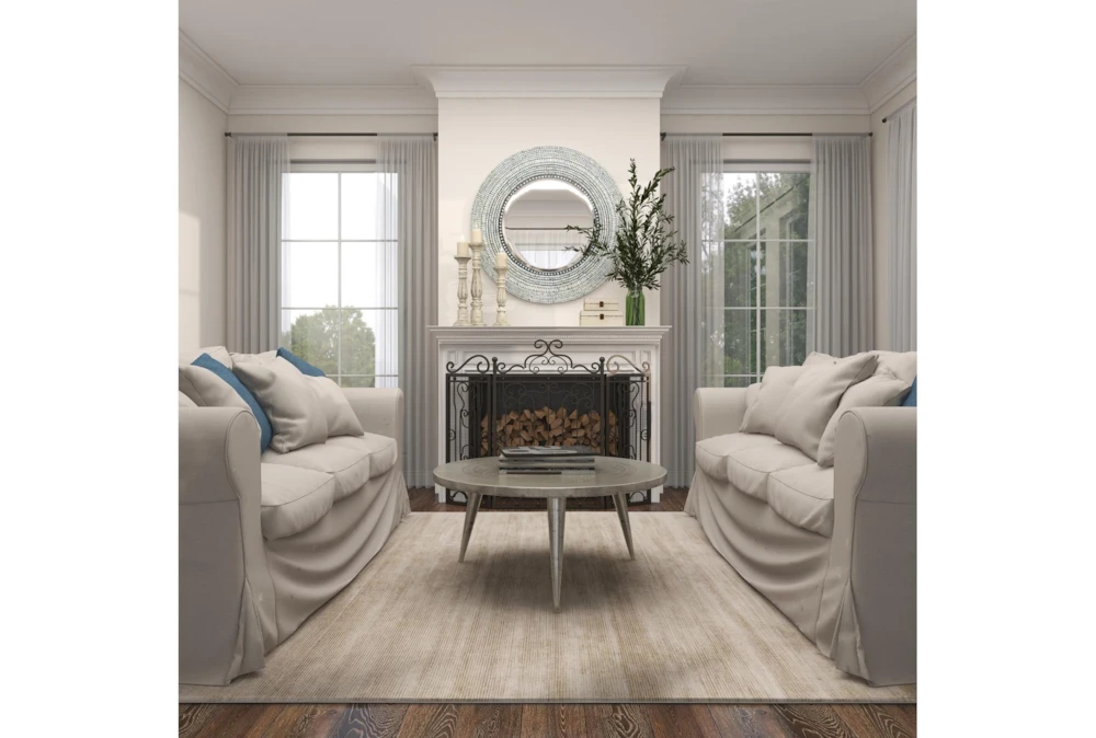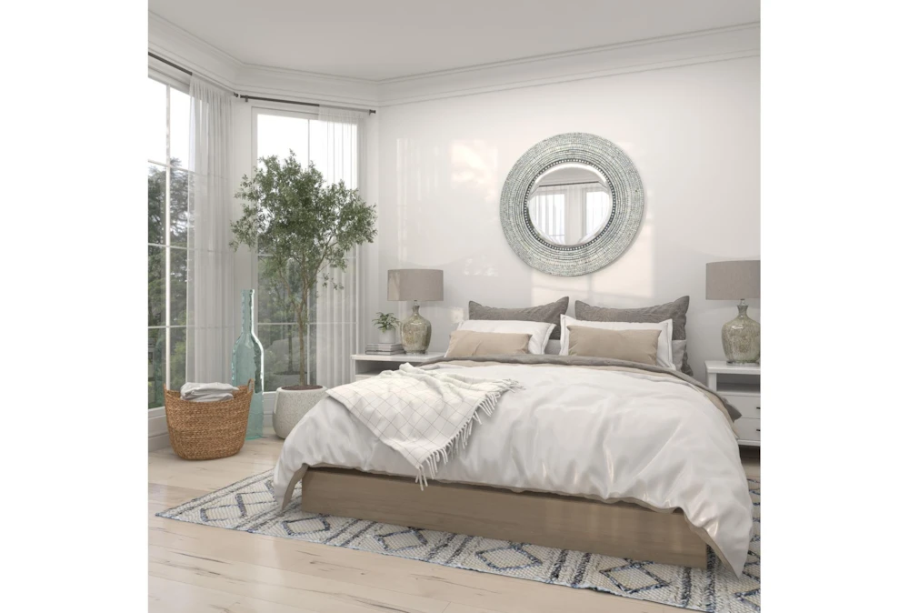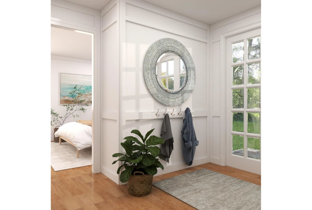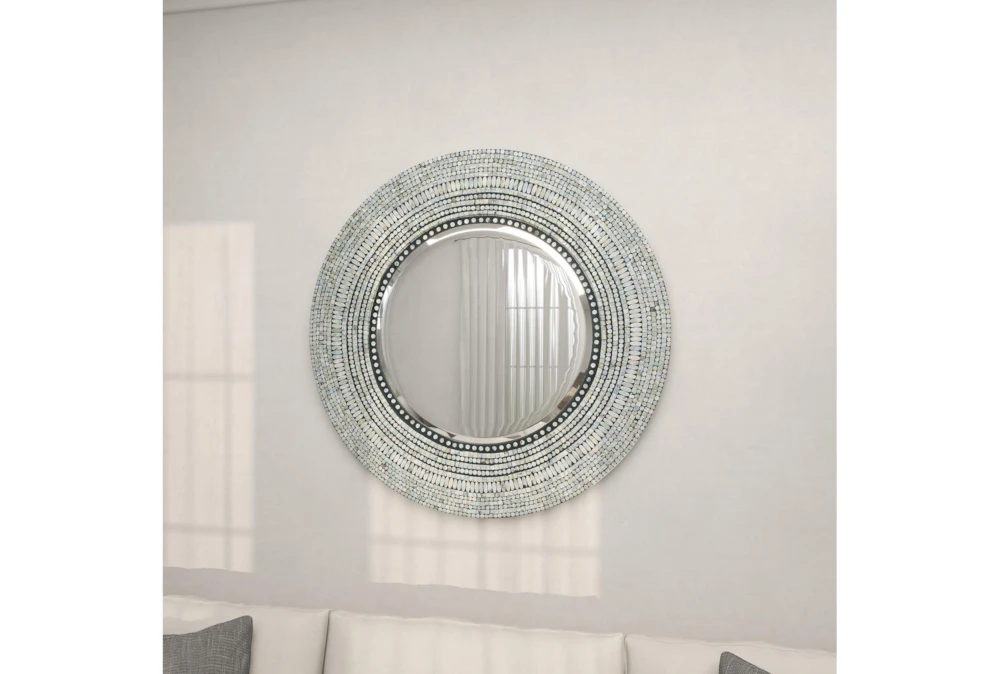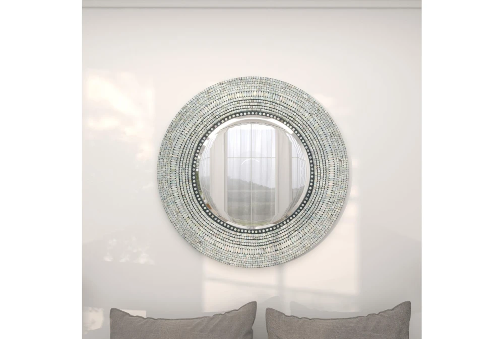 Wood Shell Inlay Mirror is a large, contemporary mirror made of sturdy MDF with iridescent shell tiles surrounding the reflective center. This elegant mirror is perfect for adding depth to a room and assessing your looks.